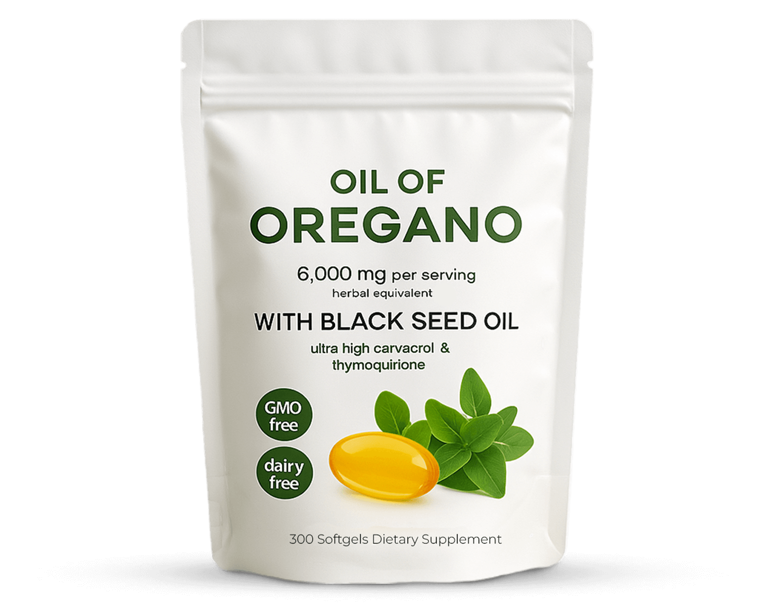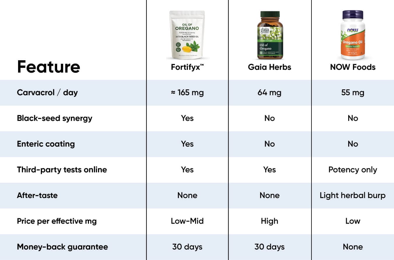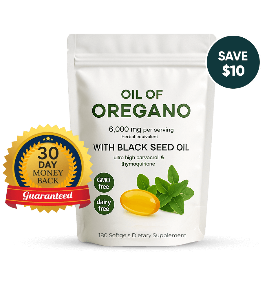 Two softgels deliver 6,000 mg oil-of-oregano (from a 20 : 1 extract, naturally 60 % carvacrol ≈ 165 mg) plus 200 mg black-seed oil (source of thymoquinone). Enteric coating ensures both oils reach the intestine before releasing.