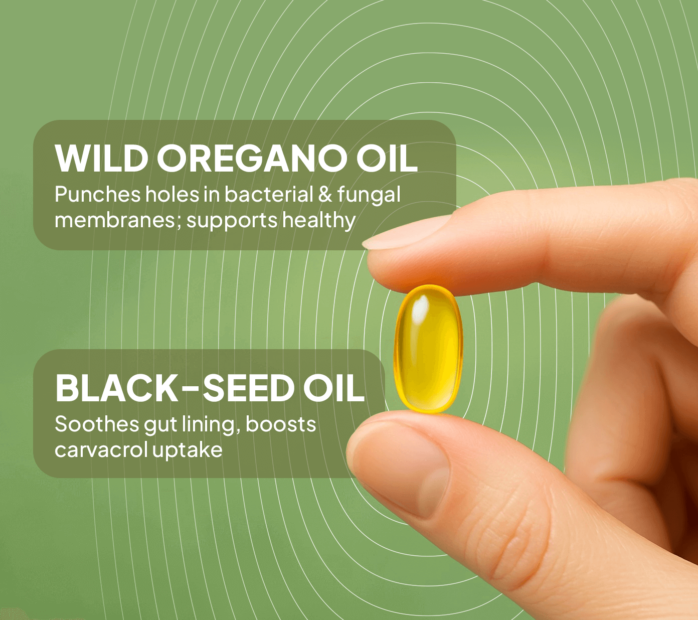 Each Riveton softgel pairs wild oregano oil (60 % carvacrol) to punch through cold-causing germs and nail fungus – with black-seed thymoquinone, which calms the gut and boosts oregano’s reach.